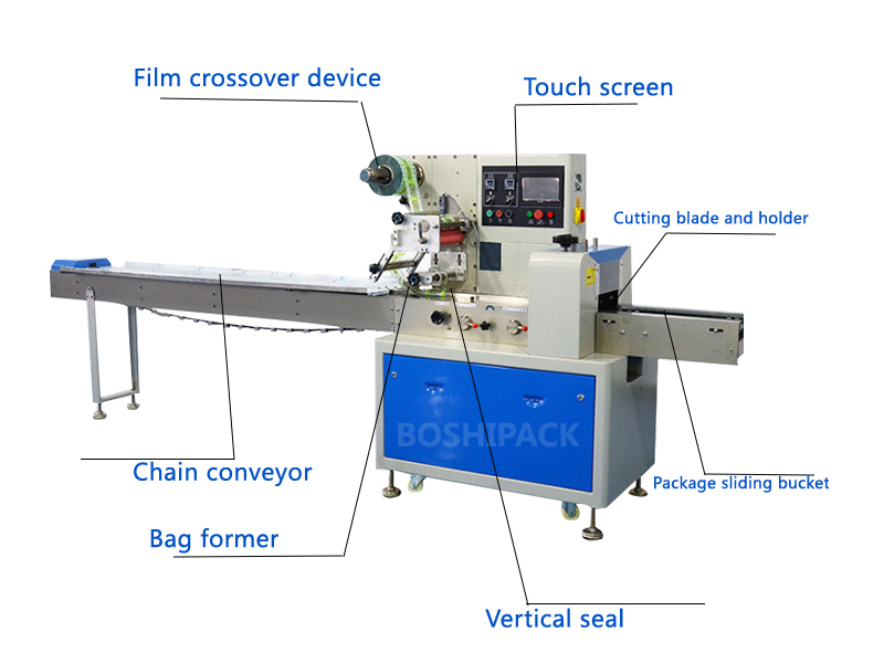(Automatic pillow packing machine, suitable for bakery bread packing, chocolate bar packing, sausage packing, popsicle packing, hardware packing, and etc.)
